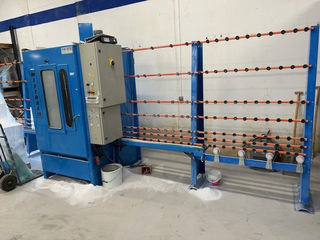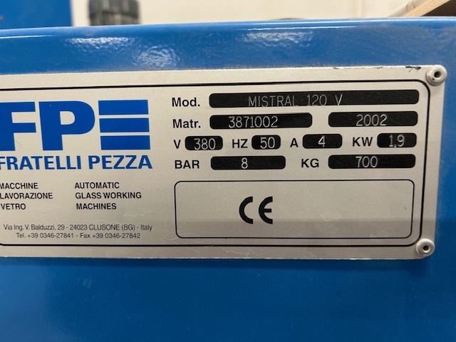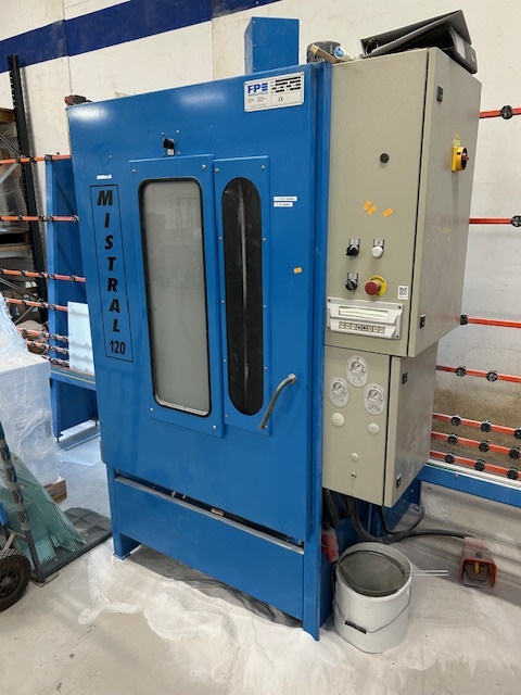 For sale the automatic flat glass sandblasting machine FRATELLI PEZZA S.r.l , Type: MISTRAL 120 V , year 2002 in very good working condition