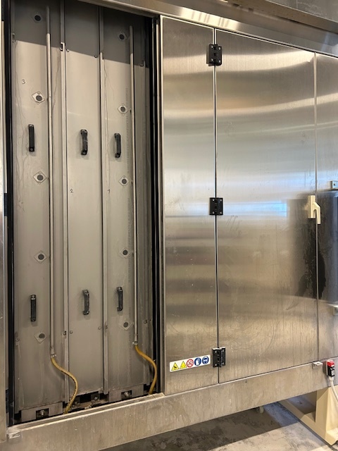 Machine body in stainless steel, mechanical parts in aluminium, brass and galvanized steel. Drying by 4 blowers. Hot air. Soundproof built-in fan.